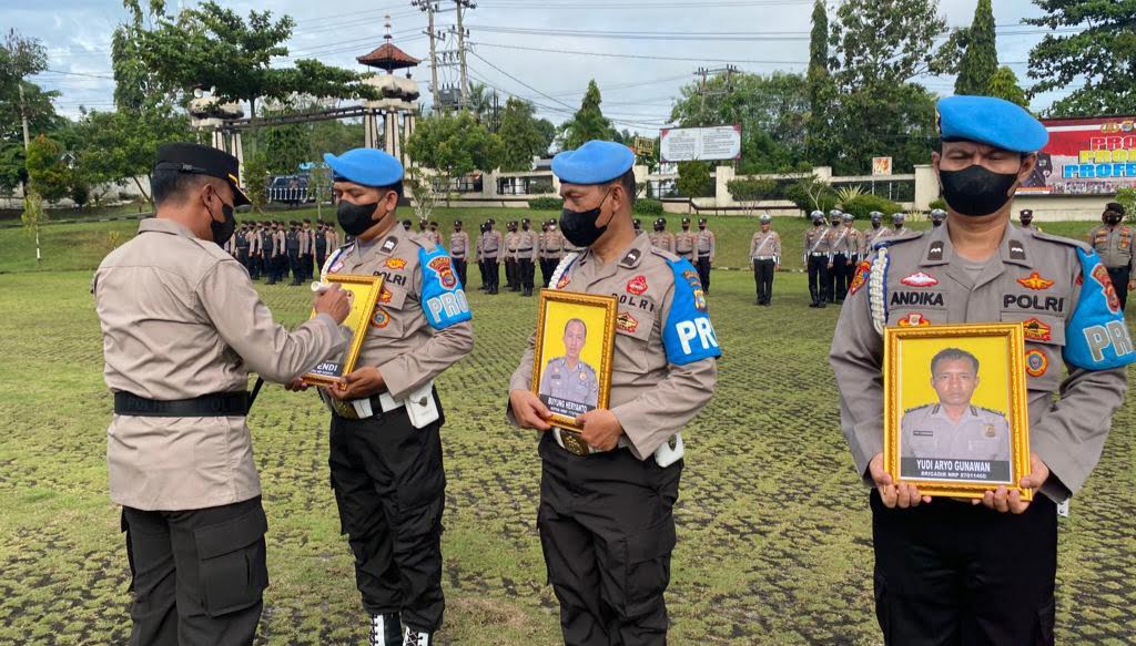 Upacara PTDH ditandai dengan pemberian tanda silang pada foto wajah para personel yakni Aipda BH, Bripka EF, Brigadir YAG, Briptu RN dan Briptu FHU.