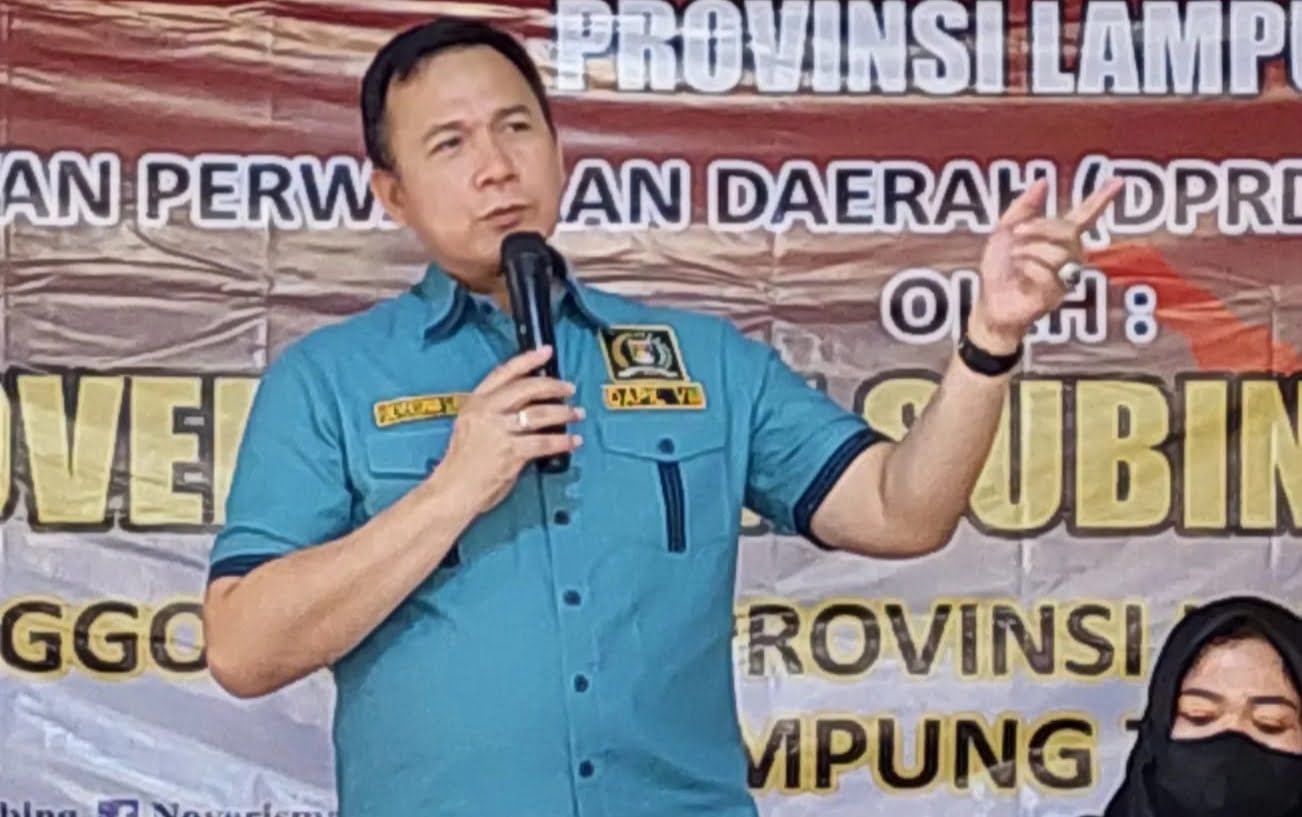 WARTA PEMBARUAN – Anggota Fraksi Partai Kebangkitan Bangsa (FPKB) yang juga Wakil Ketua Komisi III DPRD Lampung, Noverisman Subing memberikan tips kepada masyarakat agar terhindar dari Covid-19, dalam Sosialisasi Perda (Sosperda) 3/2020 tentang Adaptasi Kebiasaan Baru Dalam Pencegahan dan Pengendalian Corona di Balai Desa Ganti Warno, Kecamatan Pekalongan, Lampung Timur, Kamis (27/01/2022).