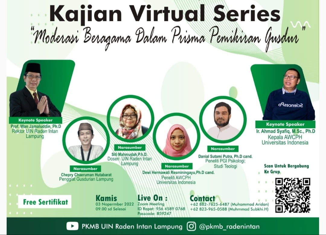 PEMBARUAN.ID – Pusat Kajian Moderasi Beragama (PKMB) UIN Raden Intan Lampung bersama Abdurrahman Wahid Center for Peace and Humanities Universitas Indonesia (AWCPH UI) menggelar Kajian Virtual Series (KVS) bertajuk “Moderasi Beragama Dalam Prisma Pemikiran Gus Dur”.
