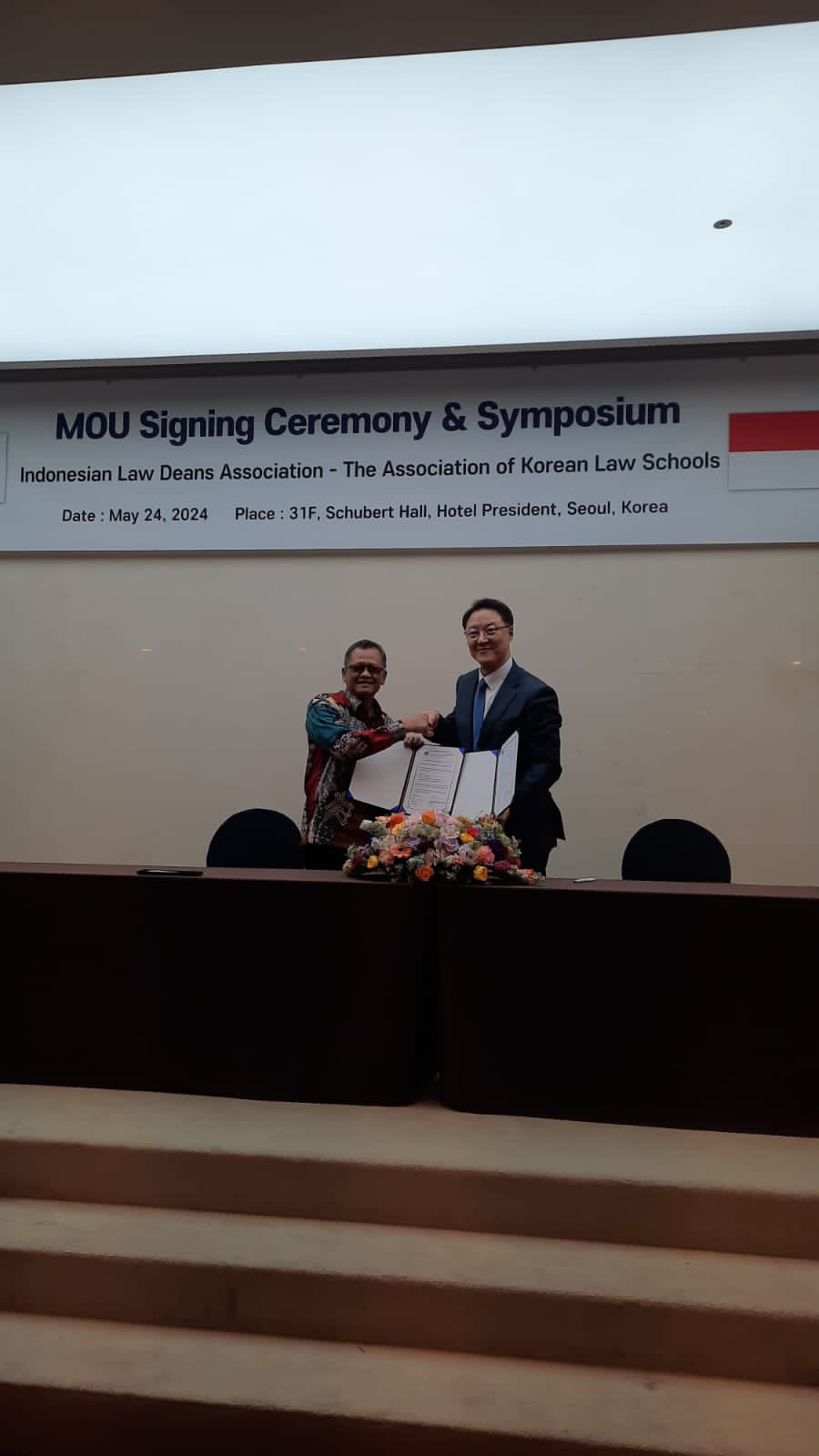 Penandatanganan MOU dilakukan oleh Dekan FH Unila, Dr. Muhammad Fakih, S.H., M.S., dan Ketua Asosiasi Fakultas Hukum Korea Selatan Prof. Sangkyung Lee. Acara ini juga dihadiri oleh 31 delagasi dari Badan Kerja Sama Fakultas Hukum se-Indonesia.