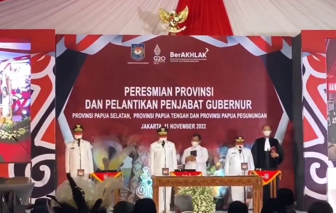 “Dengan rahmat Tuhan Yang Maha Esa, pas hari ini Jumat 11 November saya Muhammad Tito Karnavian Mendagri atas nama Presiden, dengan ini meresmikan Provinsi Papua Selatan berdasarkan UU No 14 tahun 2022, Provinsi Papua Tengah berdasarkan UU No 15 tahun 2022 dan Provinsi Papua Pegunungan berdasarkan UU Nomor 16 tahun 2022,” kata Tito di Kantor Kemendagri, Jakarta Pusat, Jumat (11/11/2022).