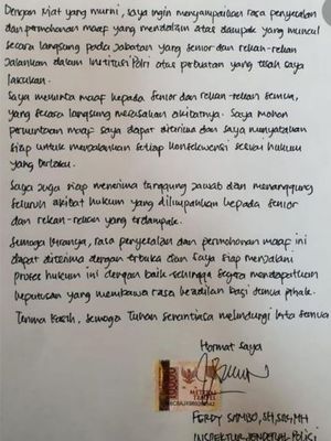 Dengan niat yang murni, saya ingin menyampaikan rasa penyesalan dan permohonan maaf yang mendalam atas dampak yang muncul secara langsung pada jabatan yang senior dan rekan-rekan jalankan dalam institusi Polri atas perbuatan saya yang telah saya lakukan.