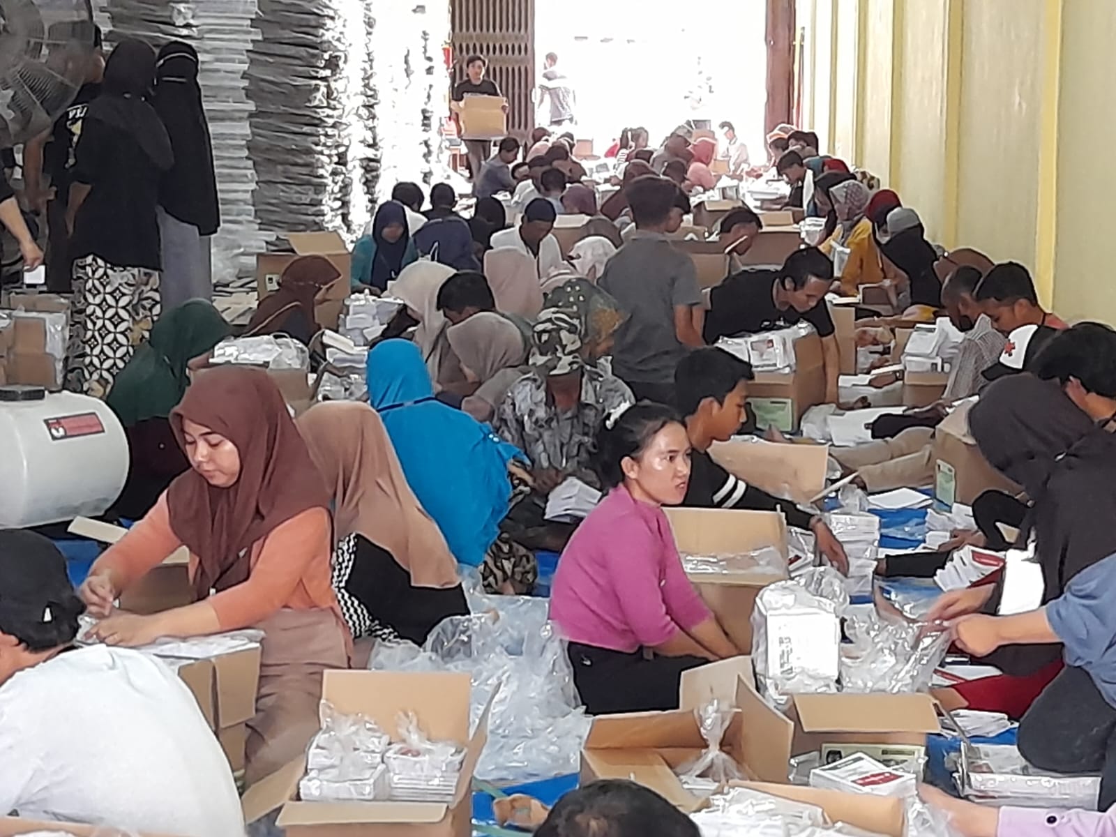 JARRAKPOSLAMPUNG – Komisi Pemilihan Umum (KPU) Kota Bandarlampung menggerakan ratusan masyarakat dalam proses sortir dan lipat surat suara Pemilu 2024 di Gudang Logistik KPU setempat, Jumat (22/12/2023).