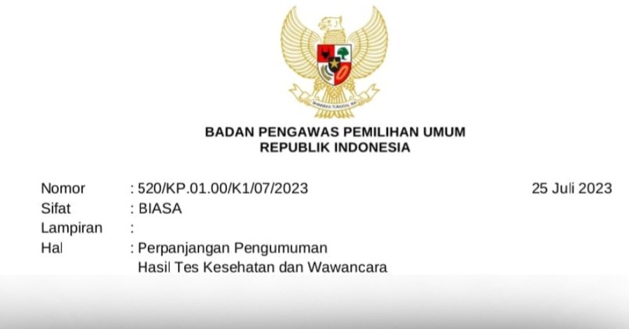 Sesuai tahapan, seharusnya pengumuman hasil tes kesehatan disampaikan pada Selasa (25/7/2023). Namun akhirnya diundur sampai Senin (31/7/2023) mendatang.